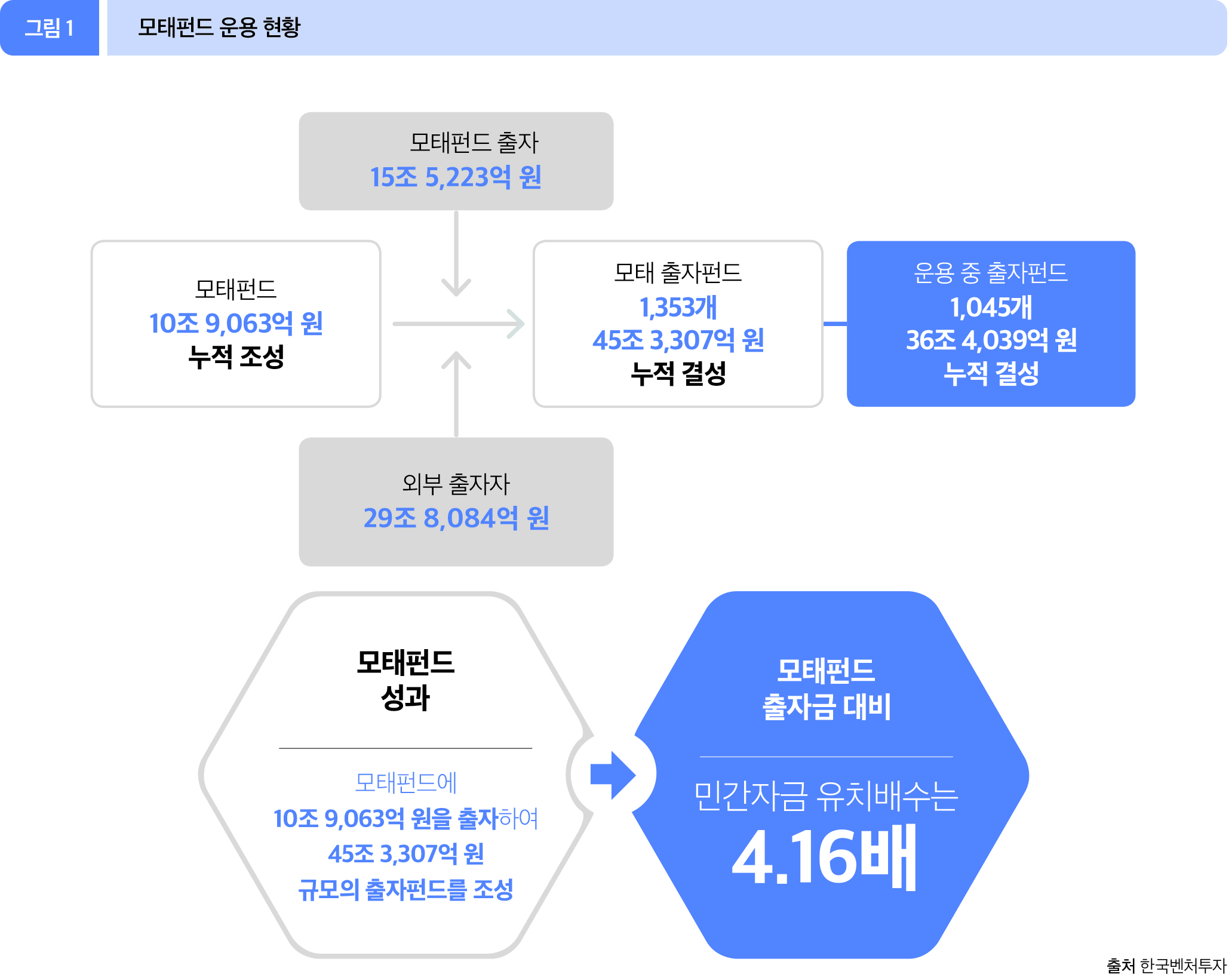 2025년 6월 말 기준 한국모태펀드(이하 ‘모태펀드’)의 누적 조성 재원은 총 10조 9,063억 원이다. 외부 출자금은 29조 2,790 억 원이며, 누적으로 1,353개*, 45조 3,307억 원 규모의 출자펀드를 결성했다. 이 중 운용 중인 출자펀드는 1,045개, 36조 4,039 억 원 규모이다. 모태펀드 설립 이후 현재까지 11,021개 사**에 투자가 집행되었다.