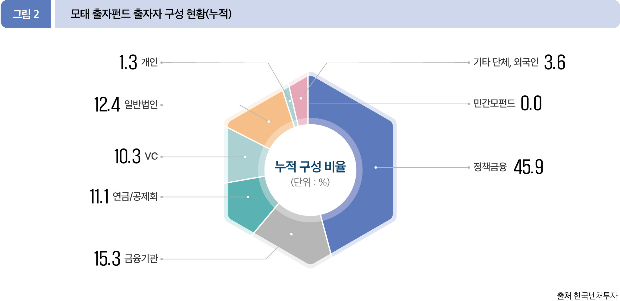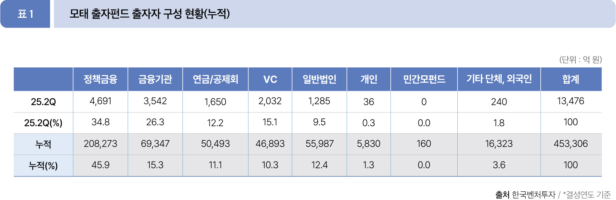 2025년 6월 말 현재 모태 출자펀드의 출자자 구성(누적)은 그림 2], 표 1]과 같다. 모태펀드를 포함한 정책금융이 20조 8,273 억 원(45.9%)을 출자하여 가장 큰 비중을 차지했고, 이어, 금융기관 6조 9,347억 원(15.3%), 일반법인 5조 5,987억 원(12.4%) 순으로 나타났다.