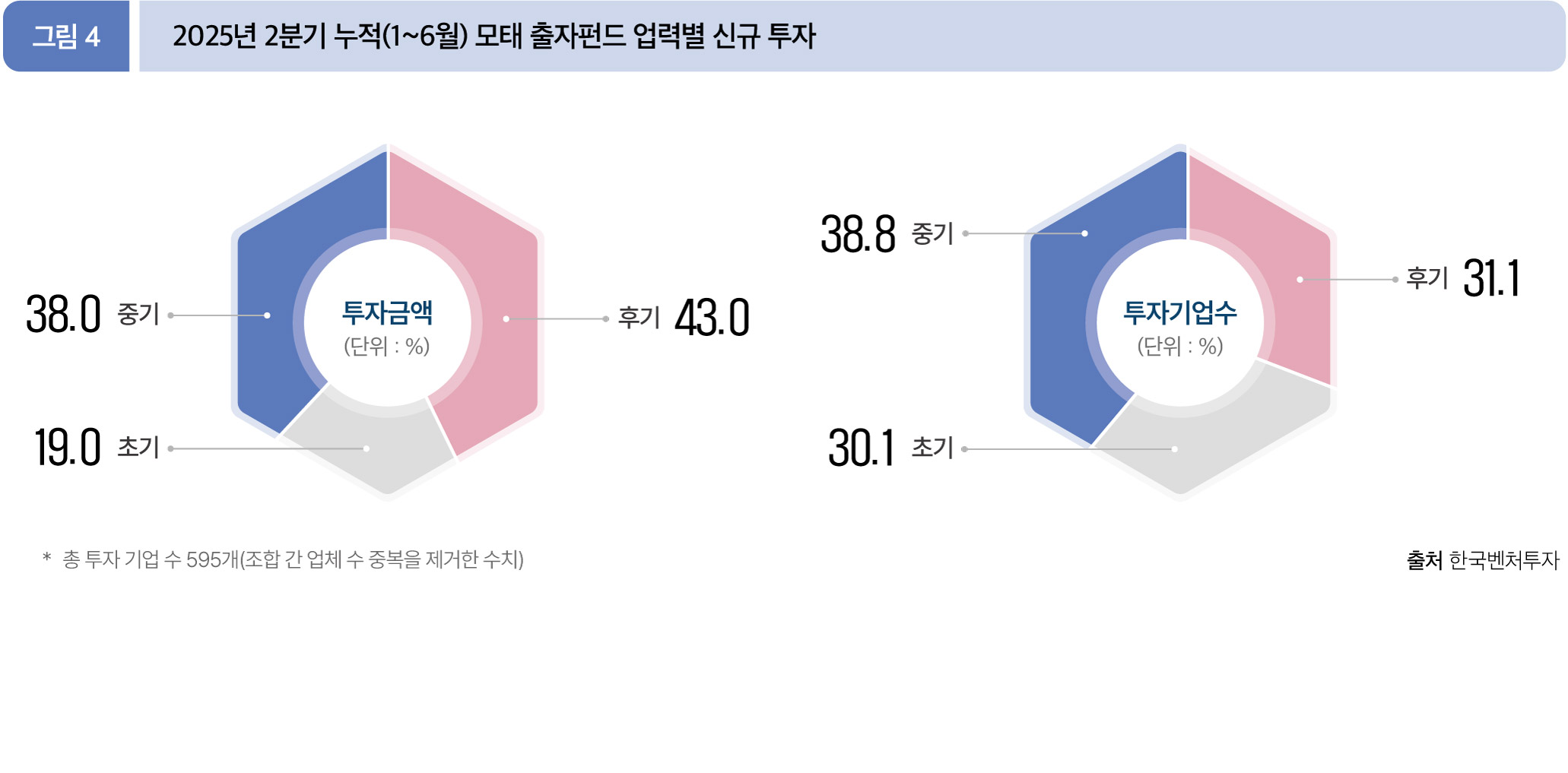 2025년 2분기 누적(1월~6월) 기준, 모태 출자펀드의 신규 투자 금액을 업력별로 살펴보면, 창업 후 3년 이내 초기기업에 2,400억 원(19.0%),3년 초과 7년 이하 중기기업에 4,805억 원(38.0%), 창업 7년 초과 후기기업에 5,433억 원(43.0%)이 투자 되었다.