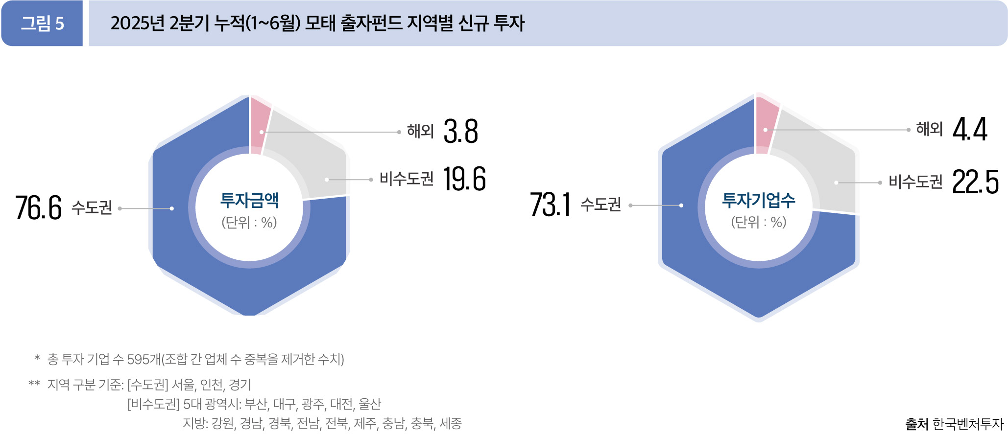 2025년 2분기 누적(1월~6월) 기준으로 모태 출자펀드의 신규 투자를 지역별로 살펴보면, 서울·경기·인천을 포함한 수도권 소 재 기업에 9,681억 원(76.6%)이 투자되었다. 비수도권에는 2,477억 원(19.6%), 해외 소재 기업에는 480억 원(3.8%)이 투자 되었다.