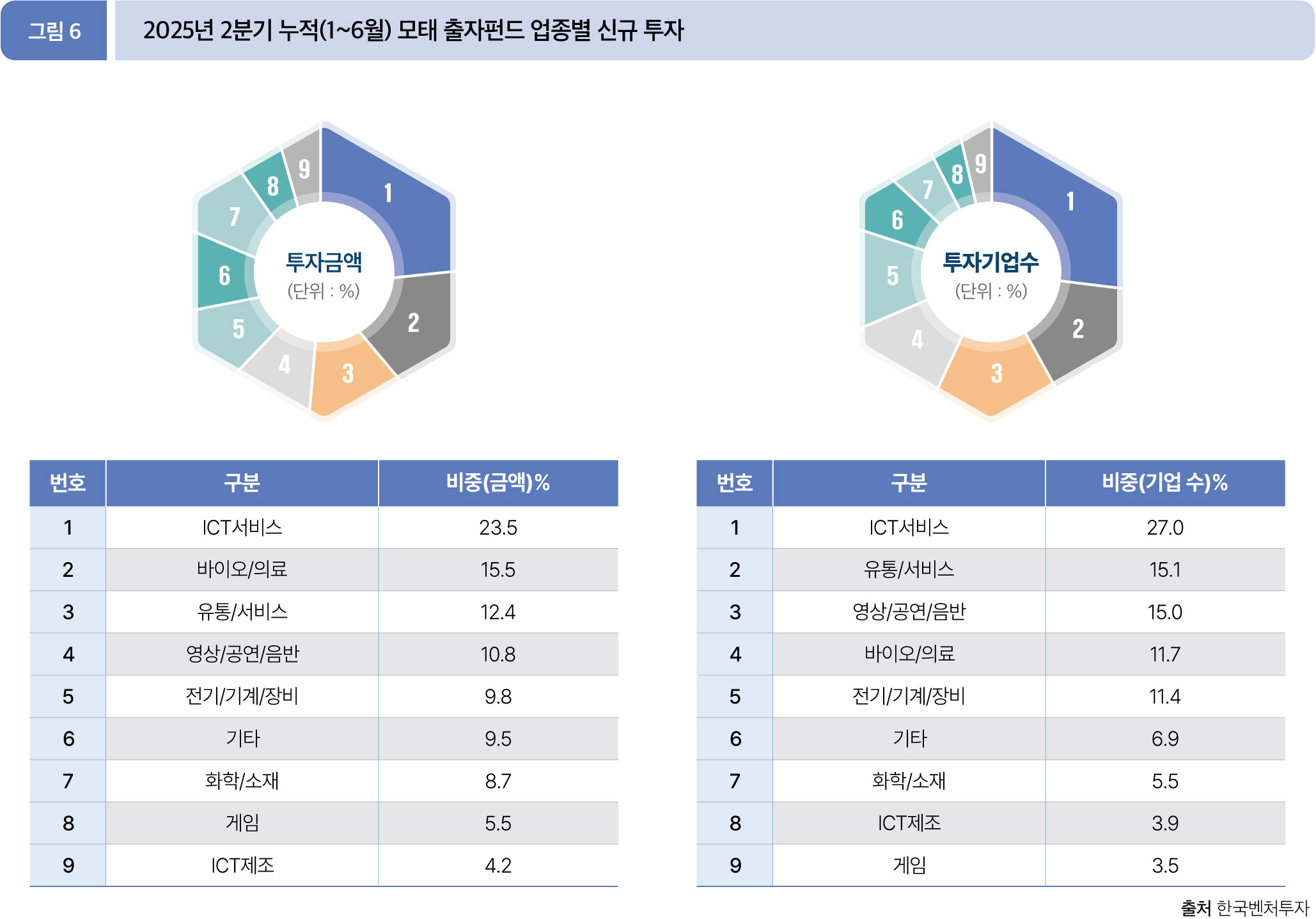 2025년 2분기 누적(1월~6월) 기준 출자펀드 신규 투자 비중이 가장 높은 업종은 ICT 서비스로, 총 2,970억 원이 투자되며 전체 투자 규모의 23.5%를 차지했다. 그 뒤를 이어 바이오/의료 1,958억 원(15.5%), 유통/서비스가 1,563억 원(12.4%)이 각각 2위와 3위를 기록했다. 업종당 투자 금액은 게임 업종이 31.5억 원으로 가장 높았고, 화학/소재 업종이 31.4억 원으로 뒤를 이었다