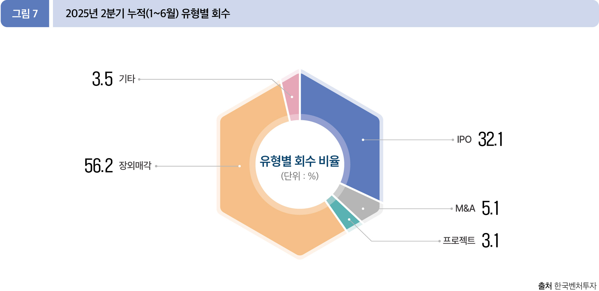 2025년 2분기 누적(1월~6월) 기준으로 총 1조 4,403억 원이 회수되었다. 전년 동기 대비 3,714억 원(20.5%) 감소했다. 회수 유형별로는 장외 매각이 8,095억 원(56.2%)으로 가장 큰 비중을 차지했고, IPO는 4,617억 원(32.1%)으로 그 뒤를 이었다.