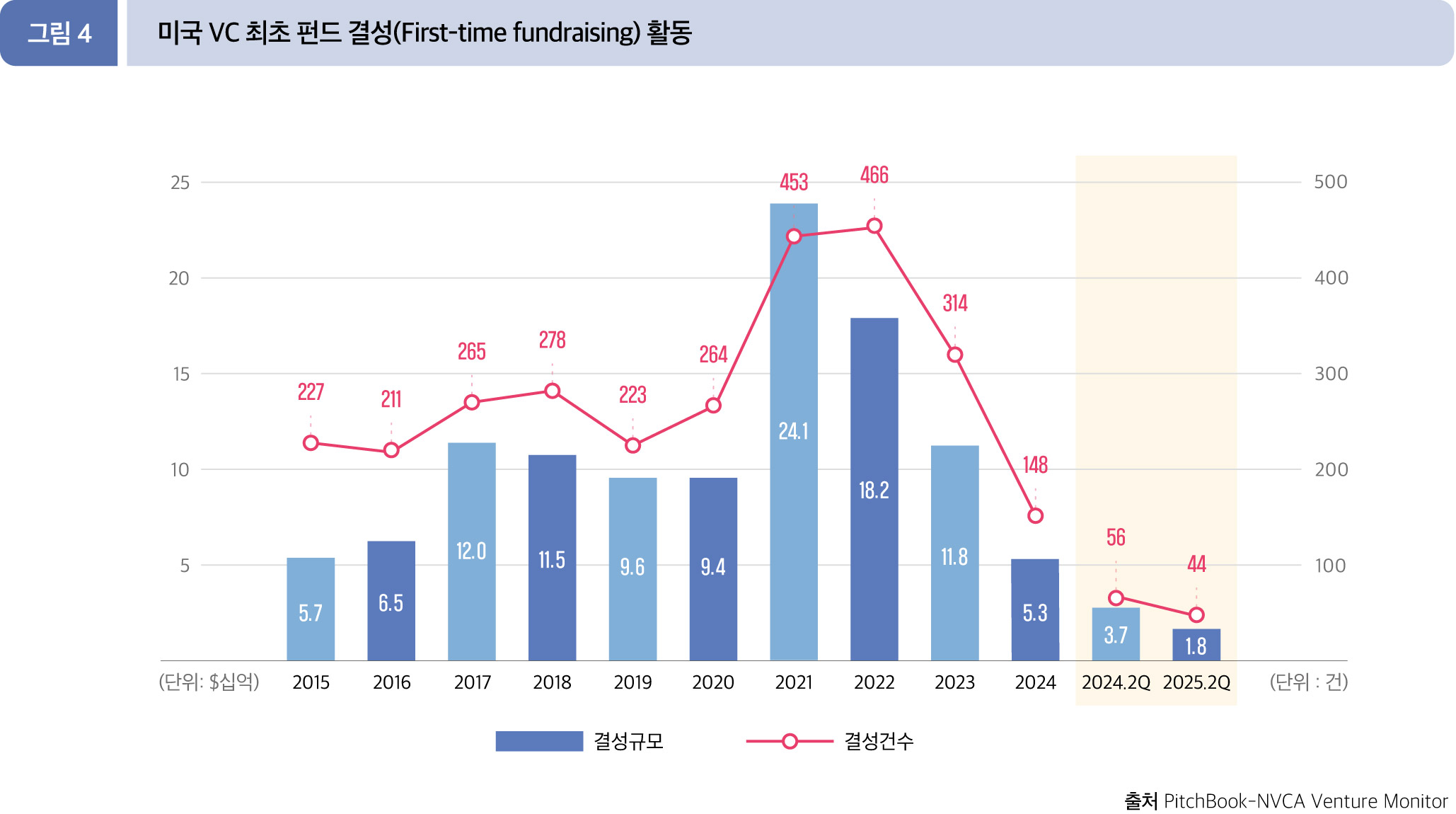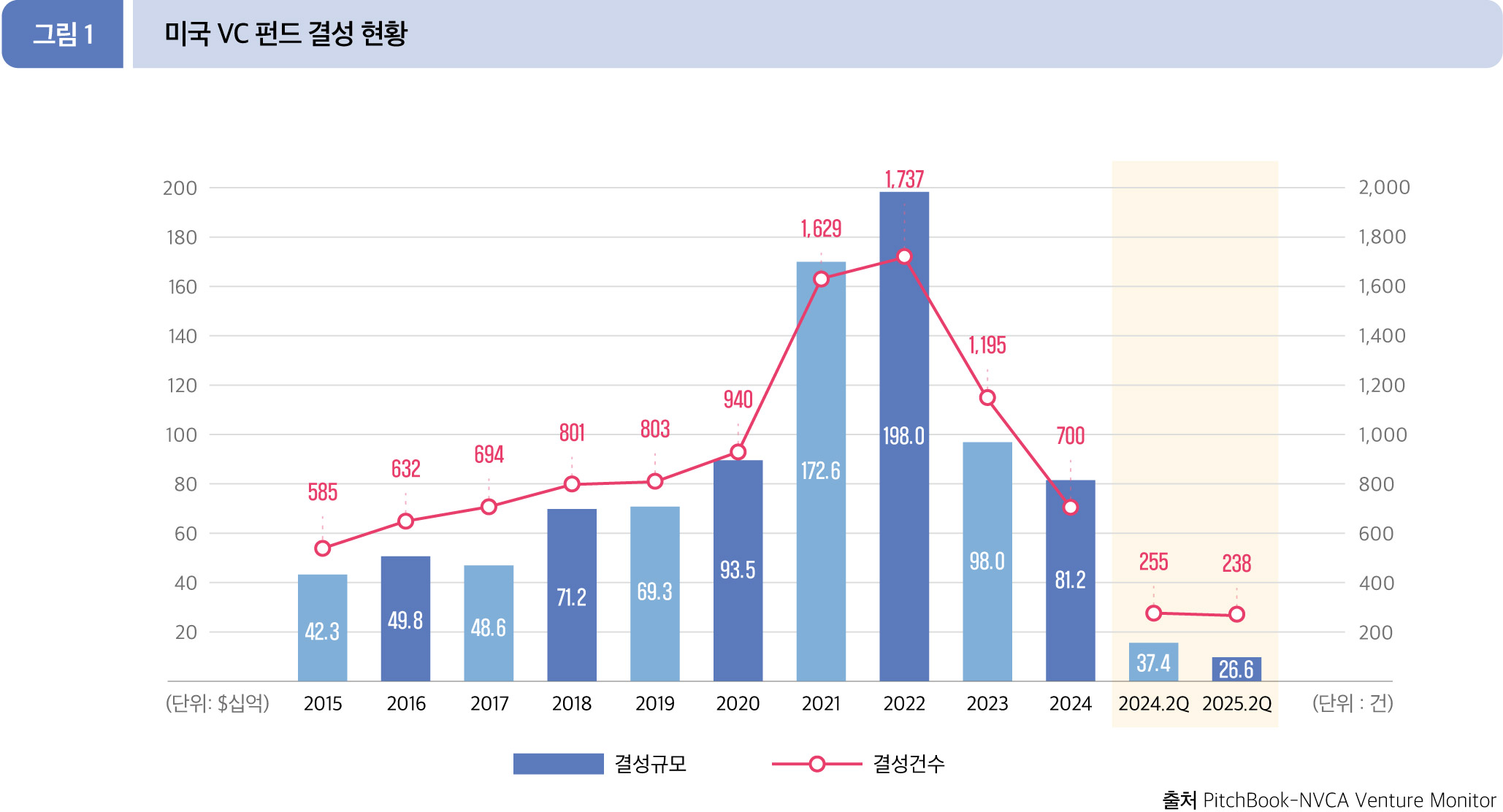 2025년 2분기 누적(1월~6월)에는 총 238개 펀드에서 265.8억 달러가 모금됐다. 전년 동기 금액은 374.3억 달러에서 29.0% 감소, 결성 수는 255건에서 6.7% 모두 감소했다.