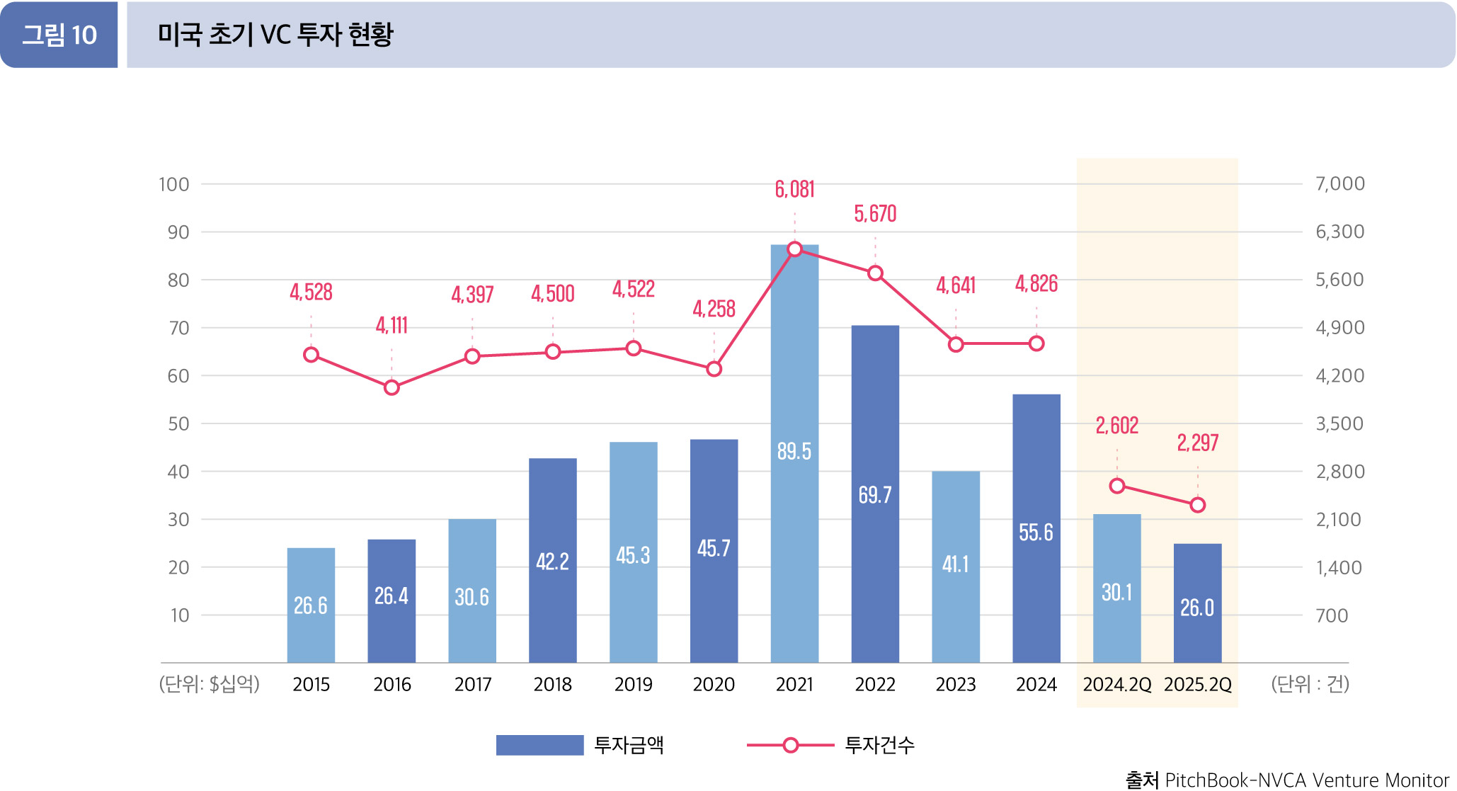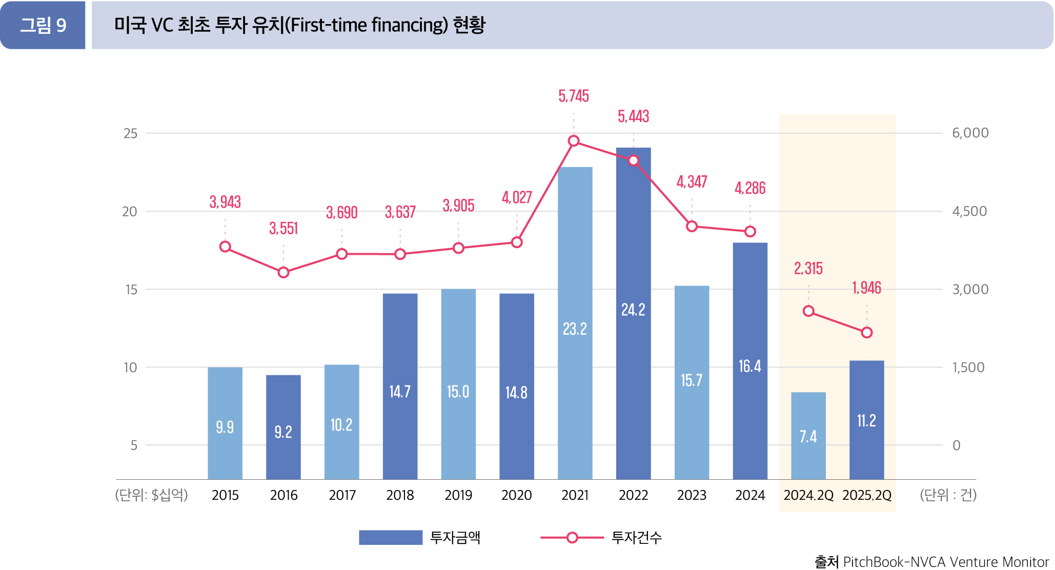 2025년 2분기 누적(1월~6월) 초기 단계에 대한 VC 투자 규모는 259.6억 달러(2,297건)로, 전년 동기 투자 금액 300.7억 달러 (2,602건)에 비해 각각 13.7%, 11.7% 감소했다.
