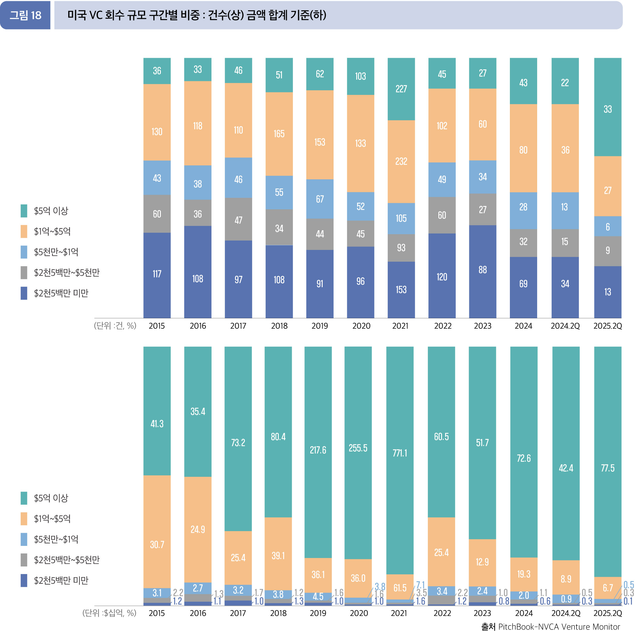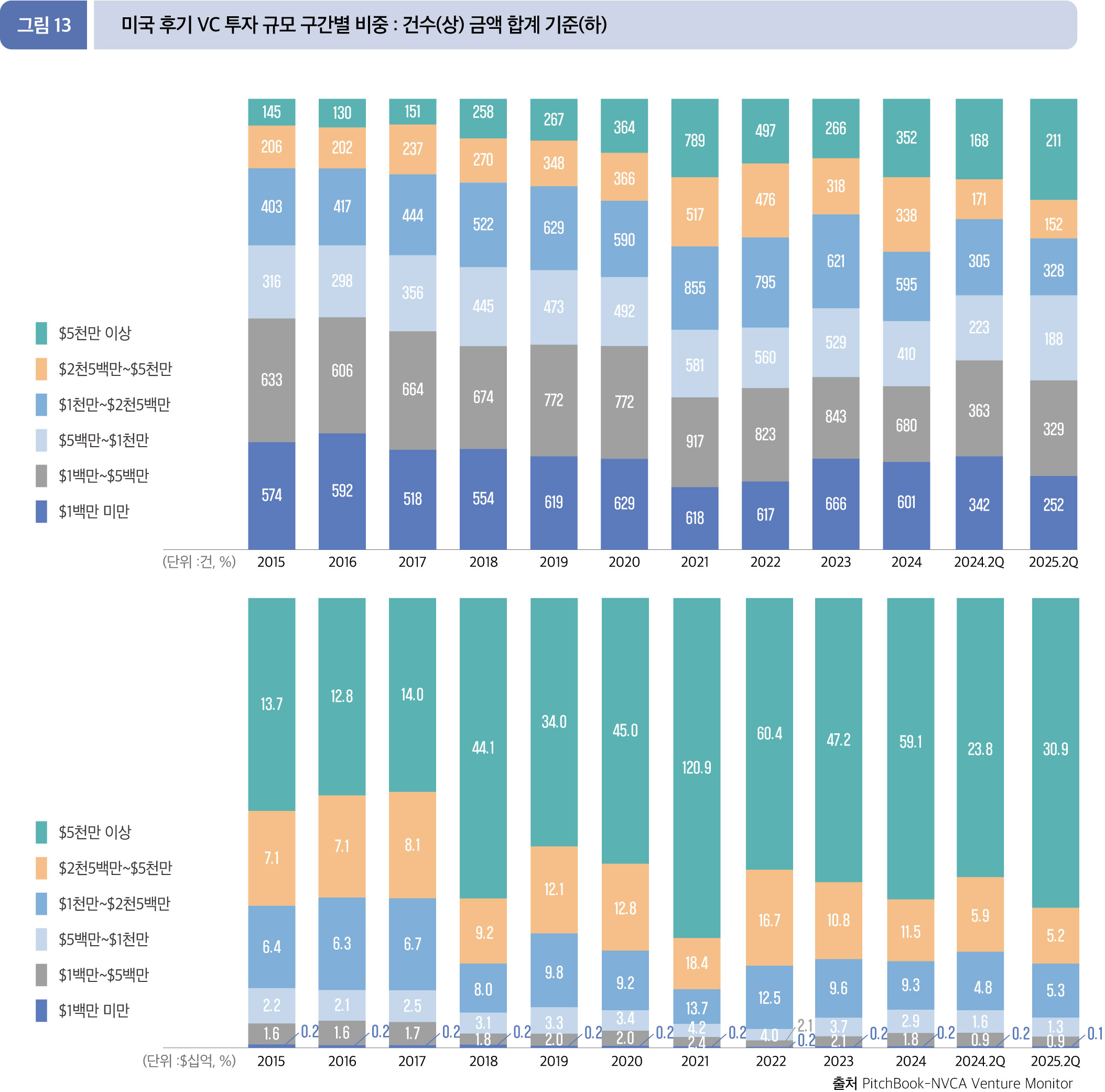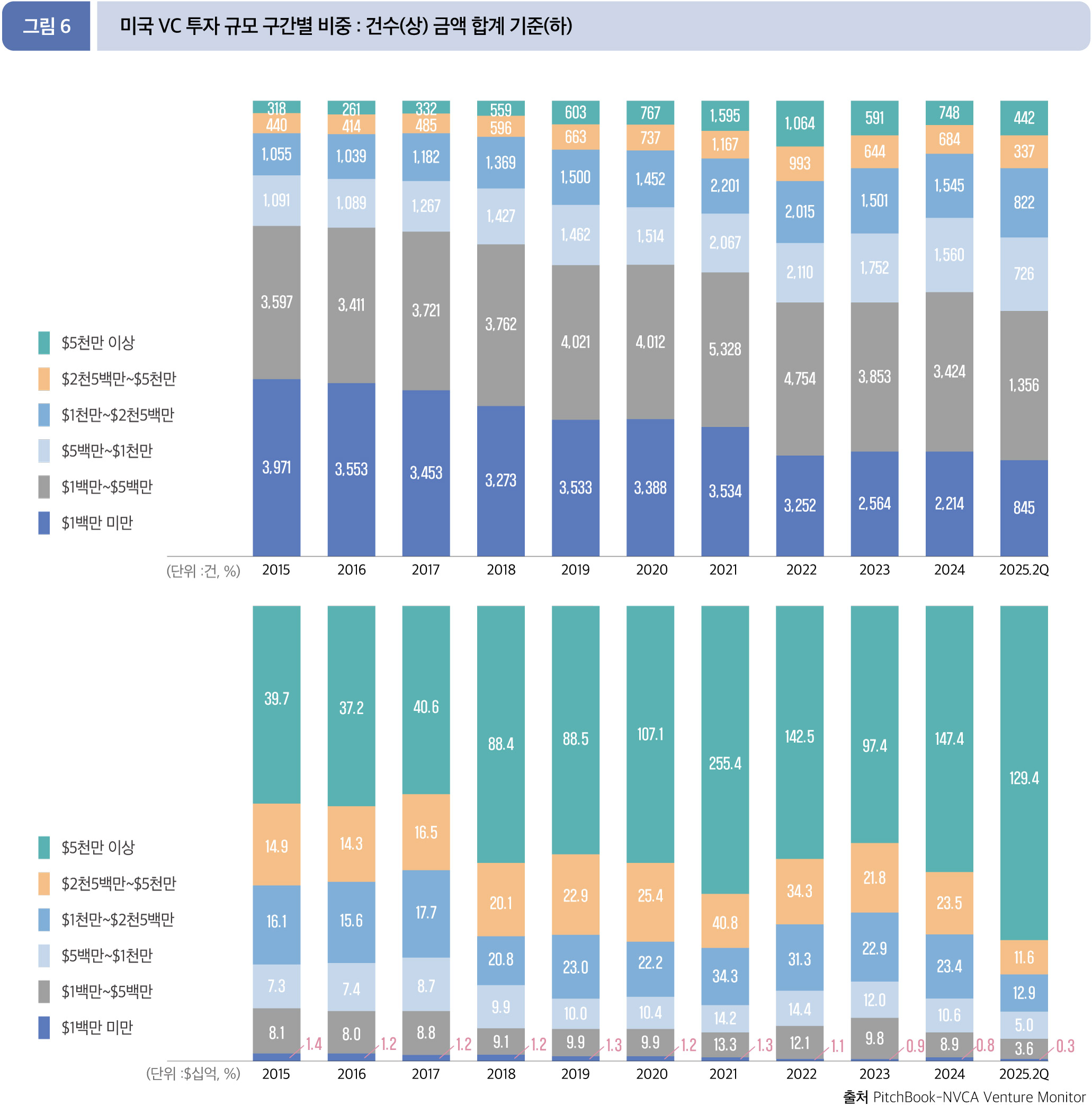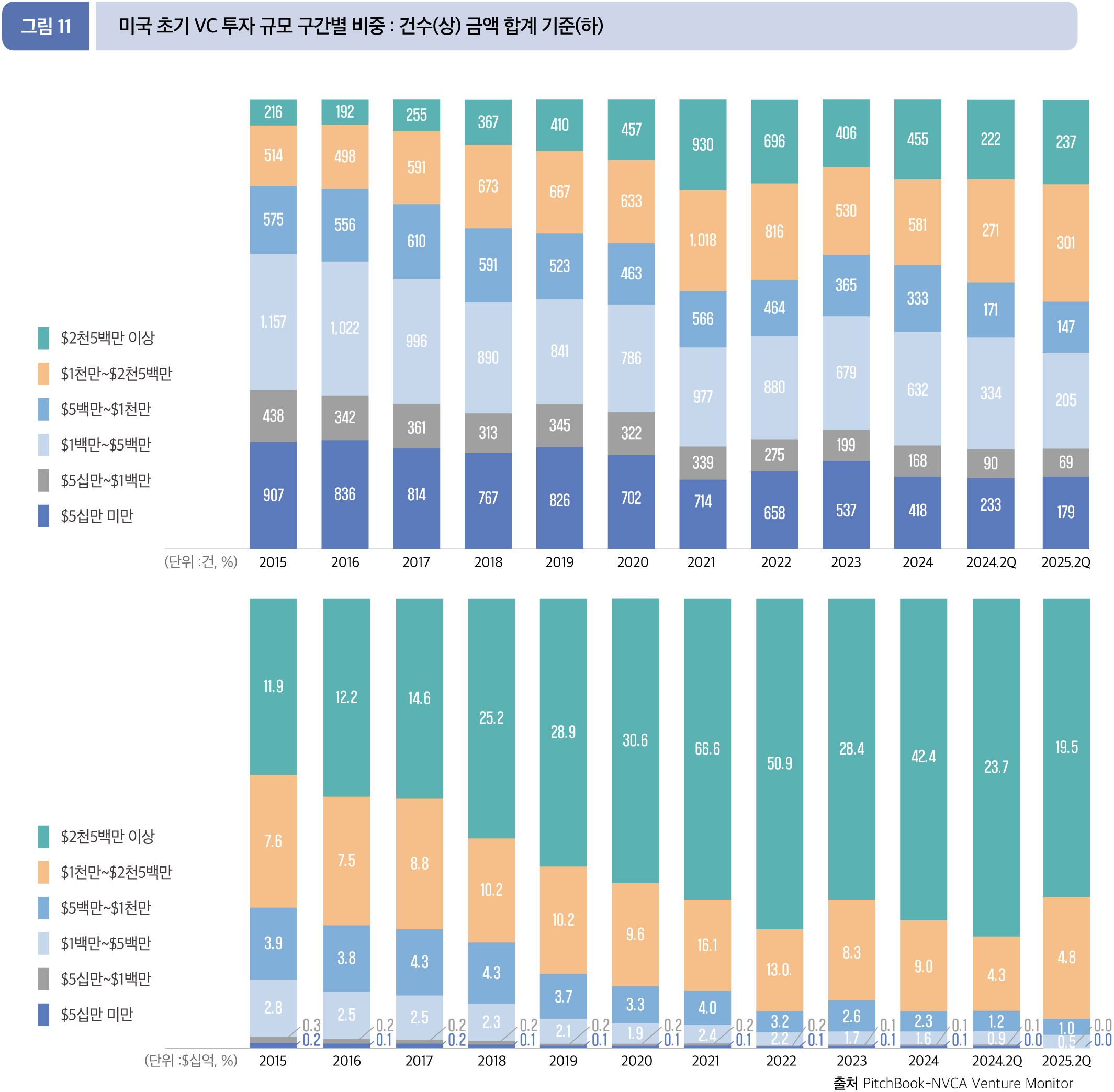 2025년 6월 말, 2분기까지의 초기 VC 단계에서 2,500만 달러 이상의 대형 투자가 투자금액으로 가장 높은 75.3%(195.5억 달러), 건수로는 237건으로 20.8%의 점유율을 보인다. 해당 구간의 투자규모를 전년 동기와 비교하면, 금액은 236.8억 달러 에서 17.4% 감소, 건수는 222건에서 6.8% 증가했다.