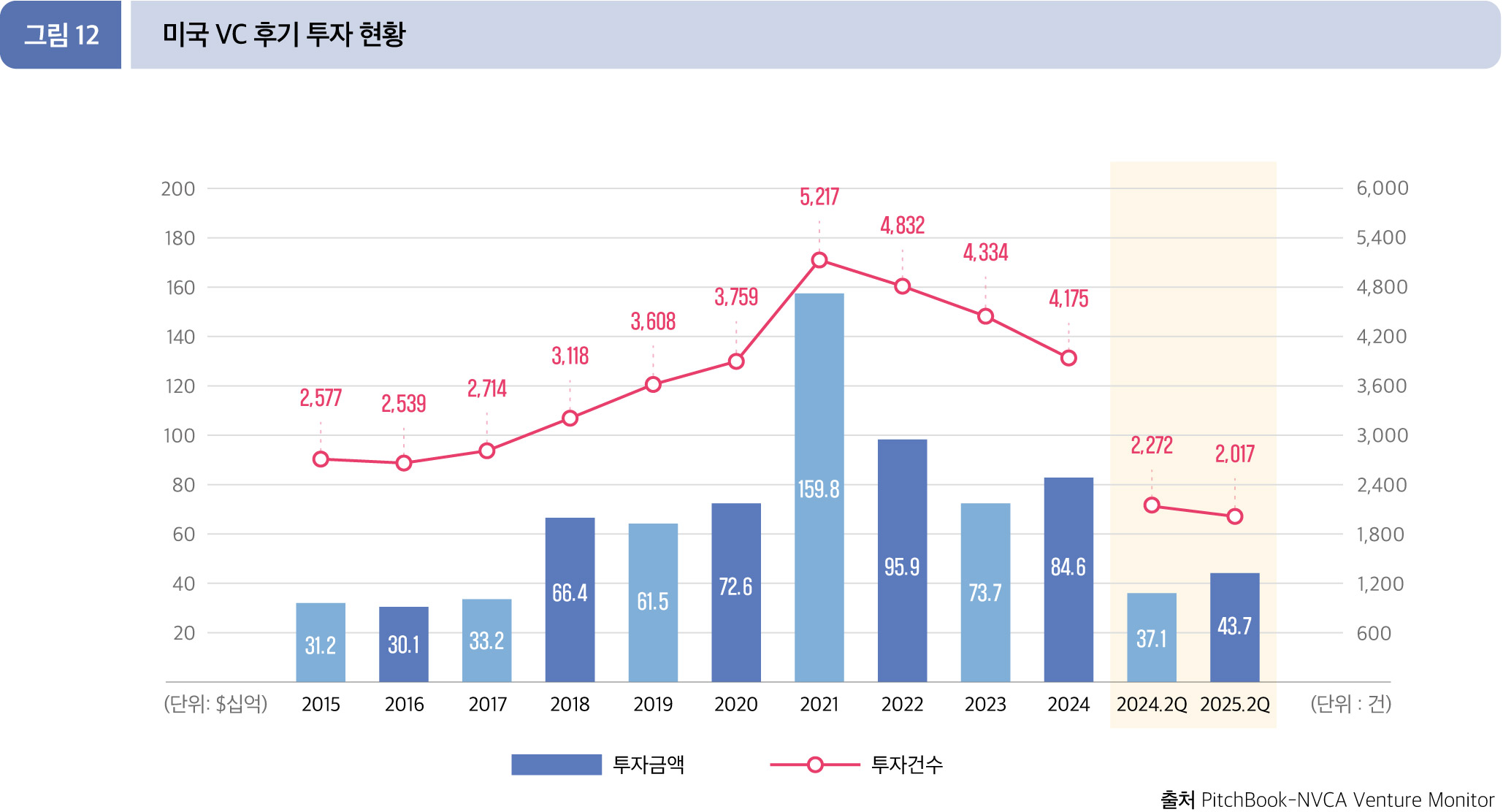 2025년 2분기 누적(1~6월) 기준 후기 VC 투자 규모는 총 436.6억 달러(2,017건)로 집계됐다. 전년 동기 371.8억 달러(2,272건) 와 비교하면 금액은 17.4% 증가, 건수는 11.2% 감소했다.
