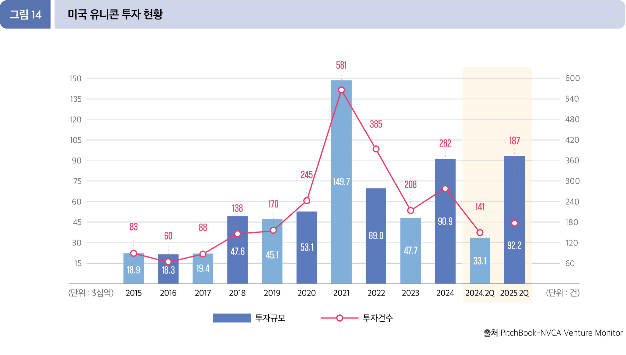 2025년 2분기 누적(1~6월) 유니콘 투자 규모는 922.2억 달러(187건)로, 괄목할 만한 성장을 기록했다. 전년 동기 331.2억 달러 (141건)와 비교하면 투자 건수 32.6% 증가, 투자 금액에서 무려 178.4% 상승했다. 특히 올해 상반기 투자 금액은 이미 2024년 전체 투자 규모인 908.6억 달러를 넘어선 수치다.