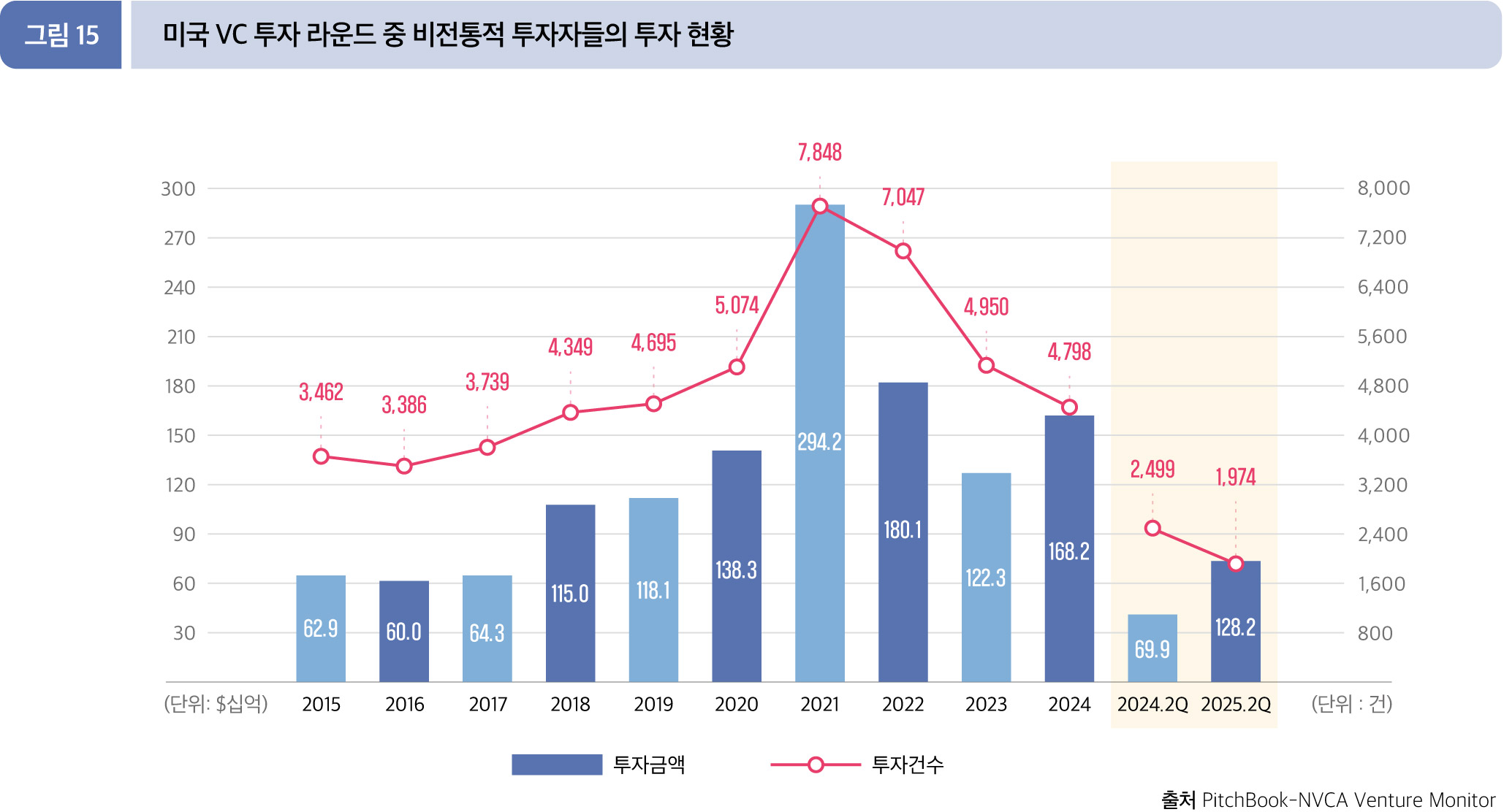 2025년 2분기 누적(1월~6월) 수치를 살펴보면, 비전통적 투자자들은 1,282.3억 달러(1,974건)를 투자했다. 전년 동기 수치인 699.4억 달러(2,499건)에 비해 투자 금액은 83.4% 증가, 투자 건수는 21.0% 감소했다.