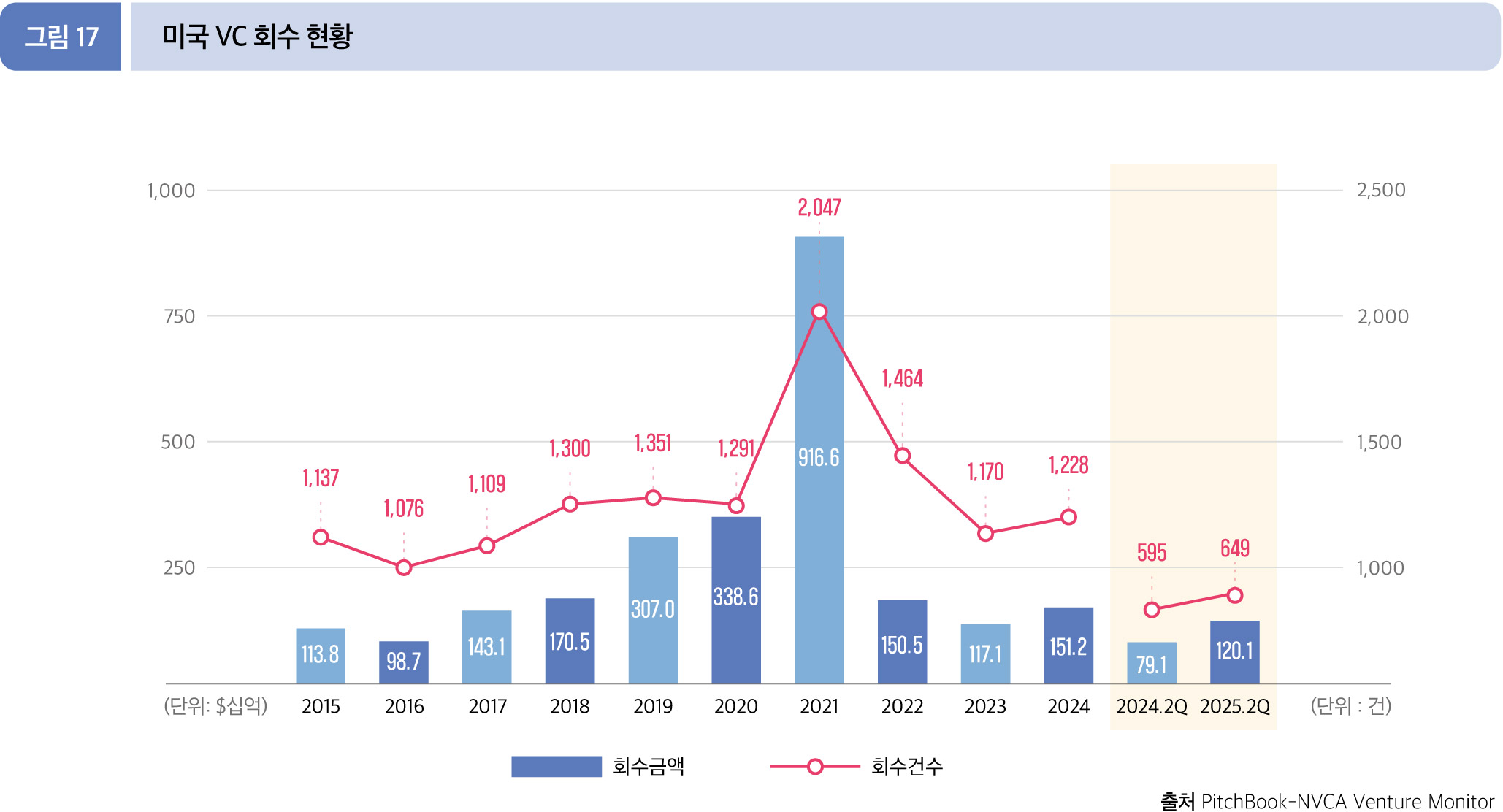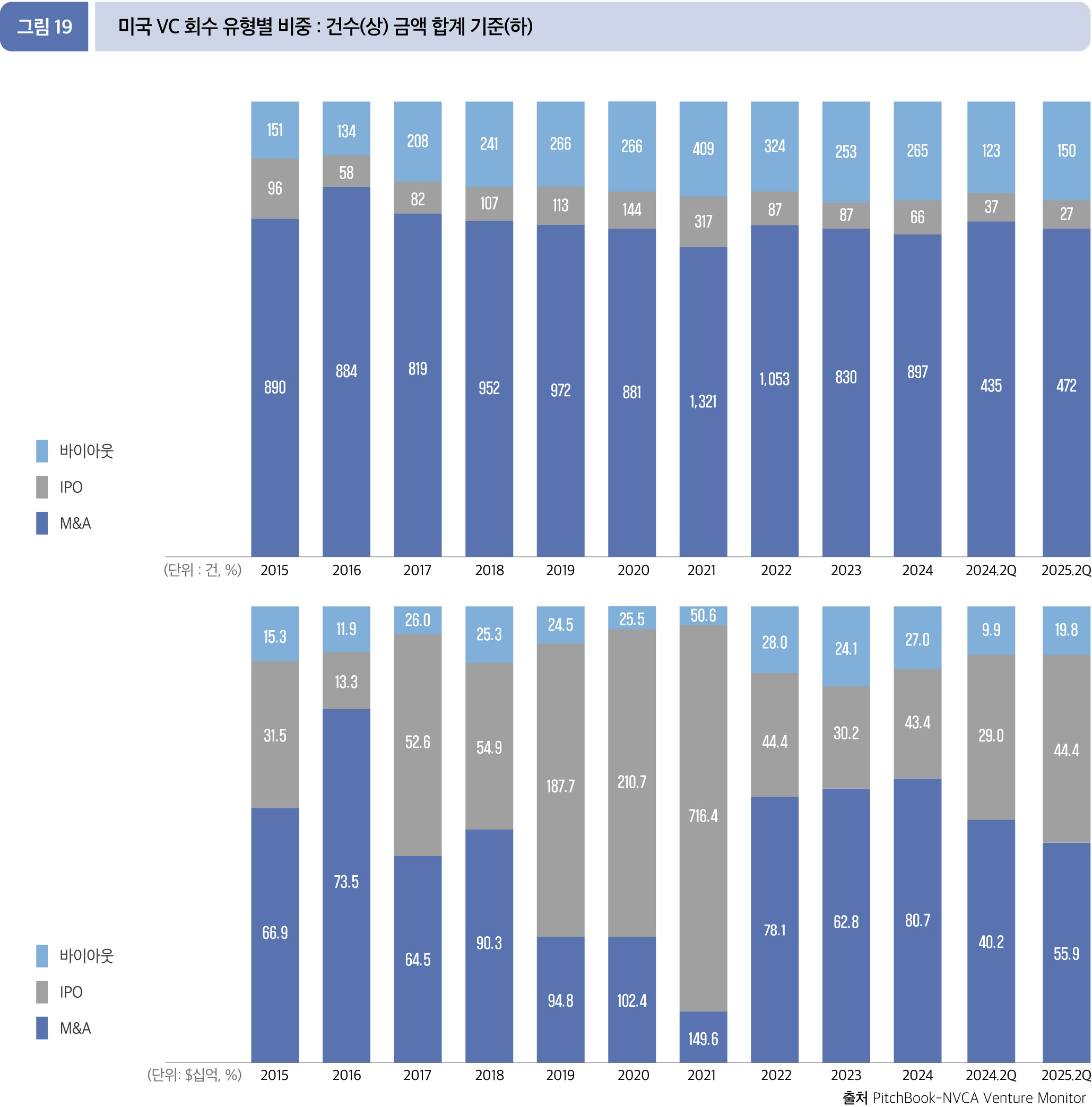 2025년 2분기 누적(1월~6월) 기준, 총 1201.0억 달러(649건)를 회수했다. 전년 동기 790.9억 달러 (595건) 대비 금액 51.9%, 건수 9.1% 각각 증가했다. * M&A 관련 회수 규모(M&A value)는 보고되거나 공개된 값에 근거한다. IPO 관련 회수 규모(IPO value)는 IPO price로 계산한 기업의 프리머니 기준 기업가치이다.