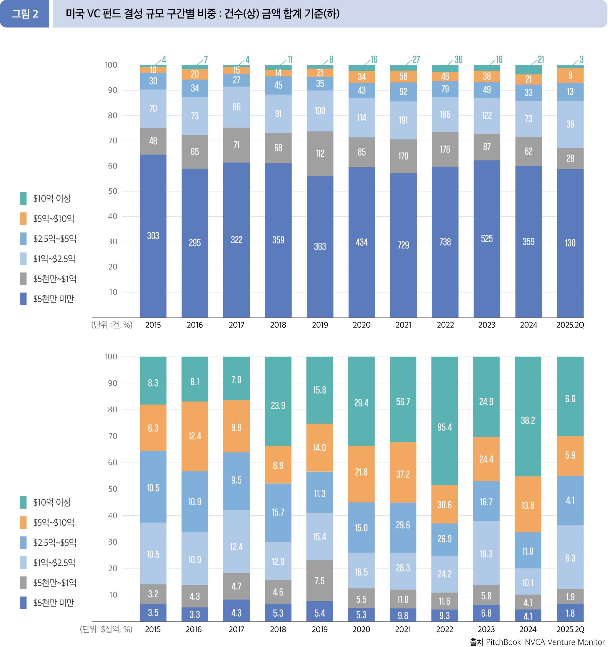 2025년 2분기 누적(1월~6월)에 5억 달러 이상의 대형 펀드가 전체 결성 금액의 47.0%(124.8억 달러)로 규모에서 가장 높은 비중을 차지했다. 건수로 가장 높은 구간은 소형 펀드(5천만 달러 이하)가 130건으로 59.4%를 점유했다.