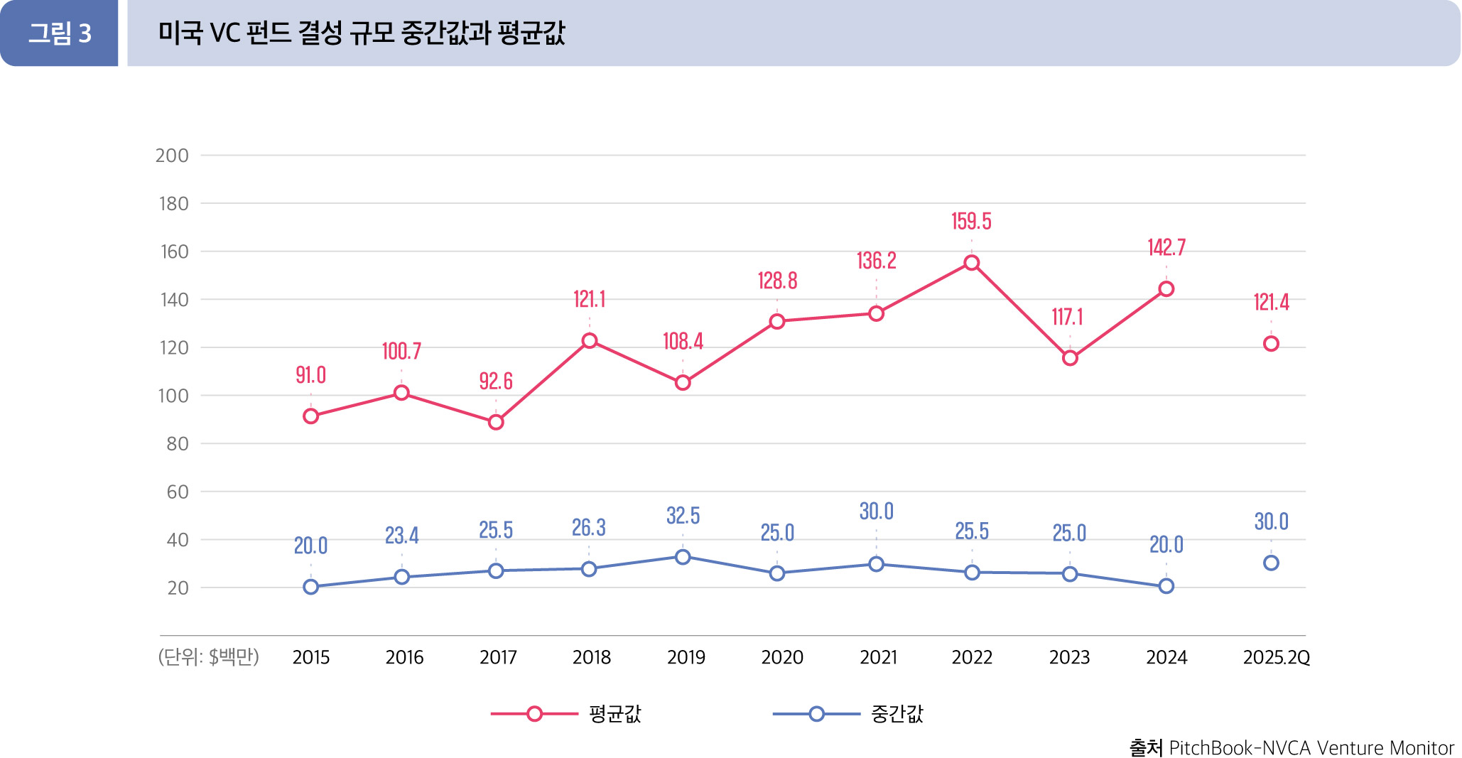 2025년 2분기 누적(1월~6월) 펀드 결성 규모의 중간값과 평균값은 각각 3,000만 달러와 1억 2,138만 달러를 기록했다.