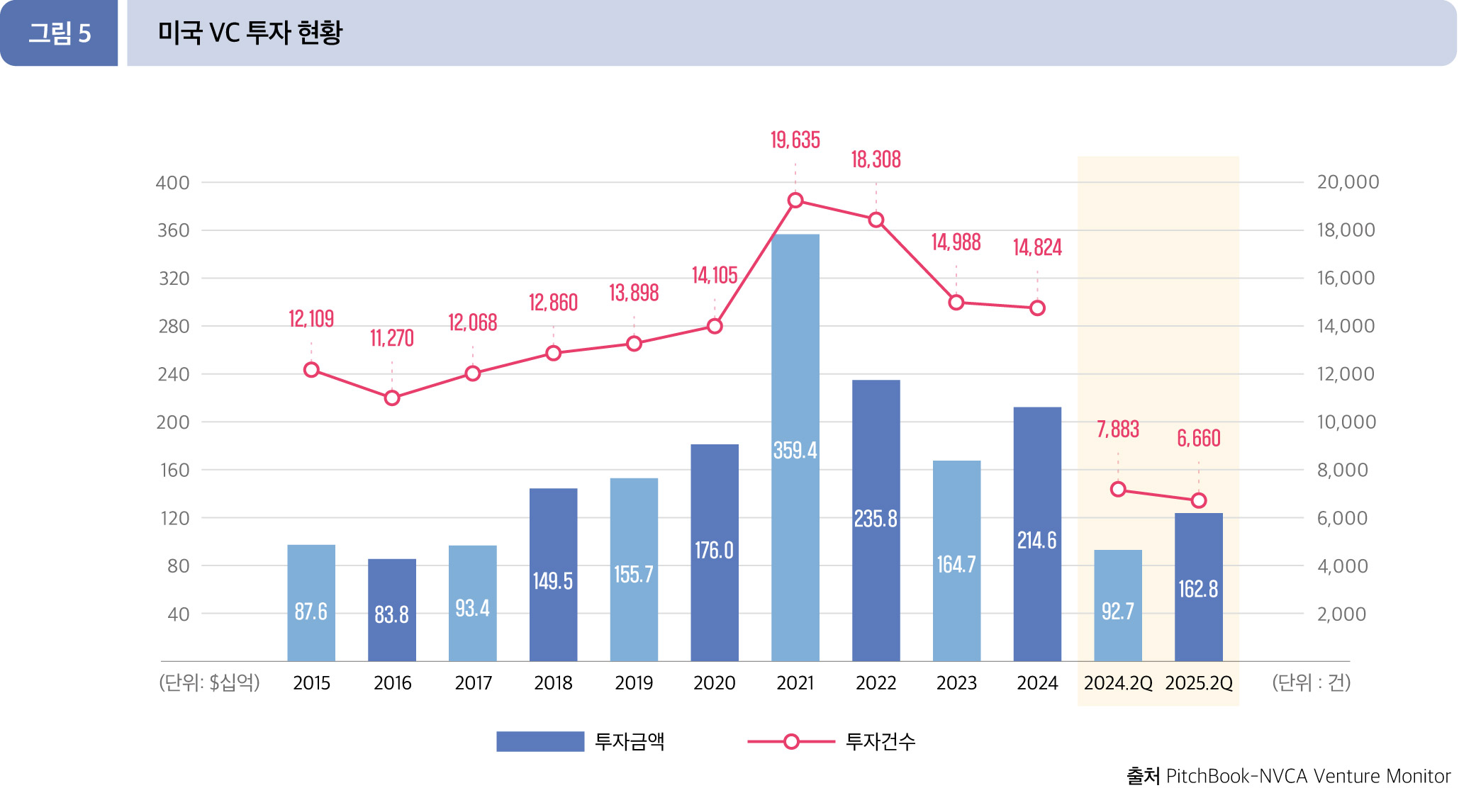 2025년 2분기 누적(1월~6월) 미국에서는 총 6,660건, 1,627.8억 달러 규모의 투자가 이루어졌다. 전년 동기 926.8억 달러 (7,833건)와 비교하면, 투자 규모는 75.6%가 증가하였으며, 투자 건수는 15.5% 감소했다.