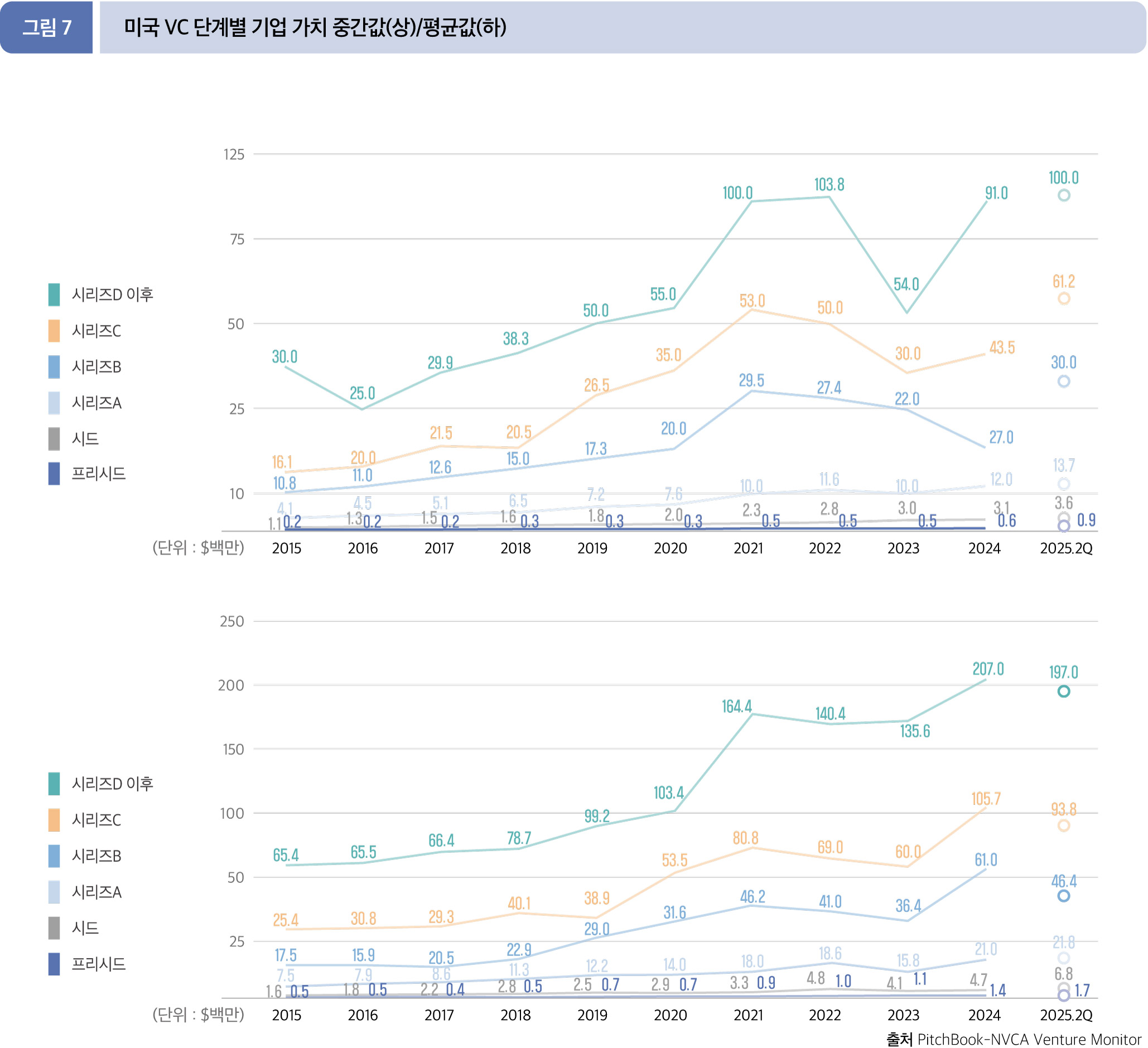 2025년 2분기 누적(1월~6월) VC 단계별 기업 가치 수치는 중간값은 전반적으로 상승세를 보였다. 그러나 시리즈 B 이상의 단계 기업에서 모두 평균값이 감소했다. 특히, 시리즈 B 단계는 중간값(4.12%)은 증가하였으나, 평균값은 23.9% 감소했다.