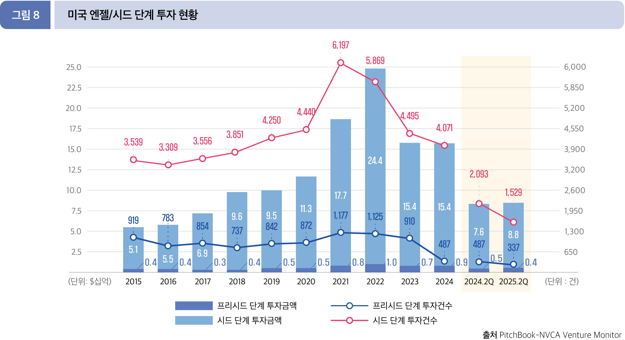 2025년 6월 말 기준으로 프리시드 단계 투자 규모는 4.3억 달러(337건)으로, 전년 동기 수치(4.8억 달러,487건)과 비교하여, 금액 11.7%, 건수 30.8% 모두 감소했다. 시드 단계는 88.0억 달러(1,529건)로 전년 동기 (75.9억 달러, 2,093건) 대비 금액은 16.0% 증가, 건수는 26.9% 감소했다.