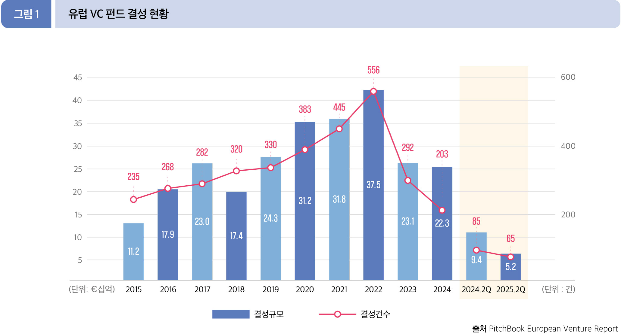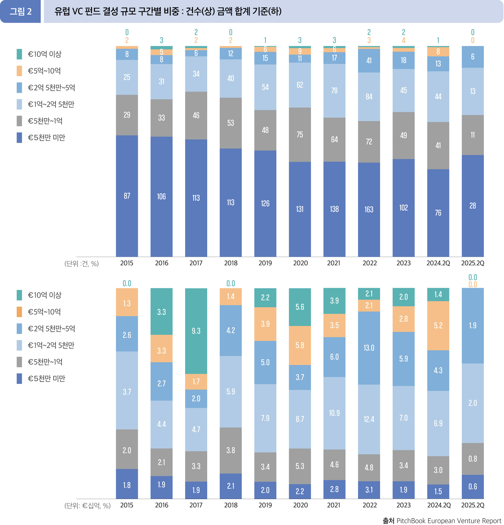 2025년 2분기(1월~6월) 유럽에서 총 65개 펀드가 52.2억 유로 규모로 결성되었으며, 이는 전년 동기(85개 펀드, 94.4억 유로) 대비 결성 규모 기준 44.7%, 건수 기준 23.5% 각각 감소한 모습을 보였다.