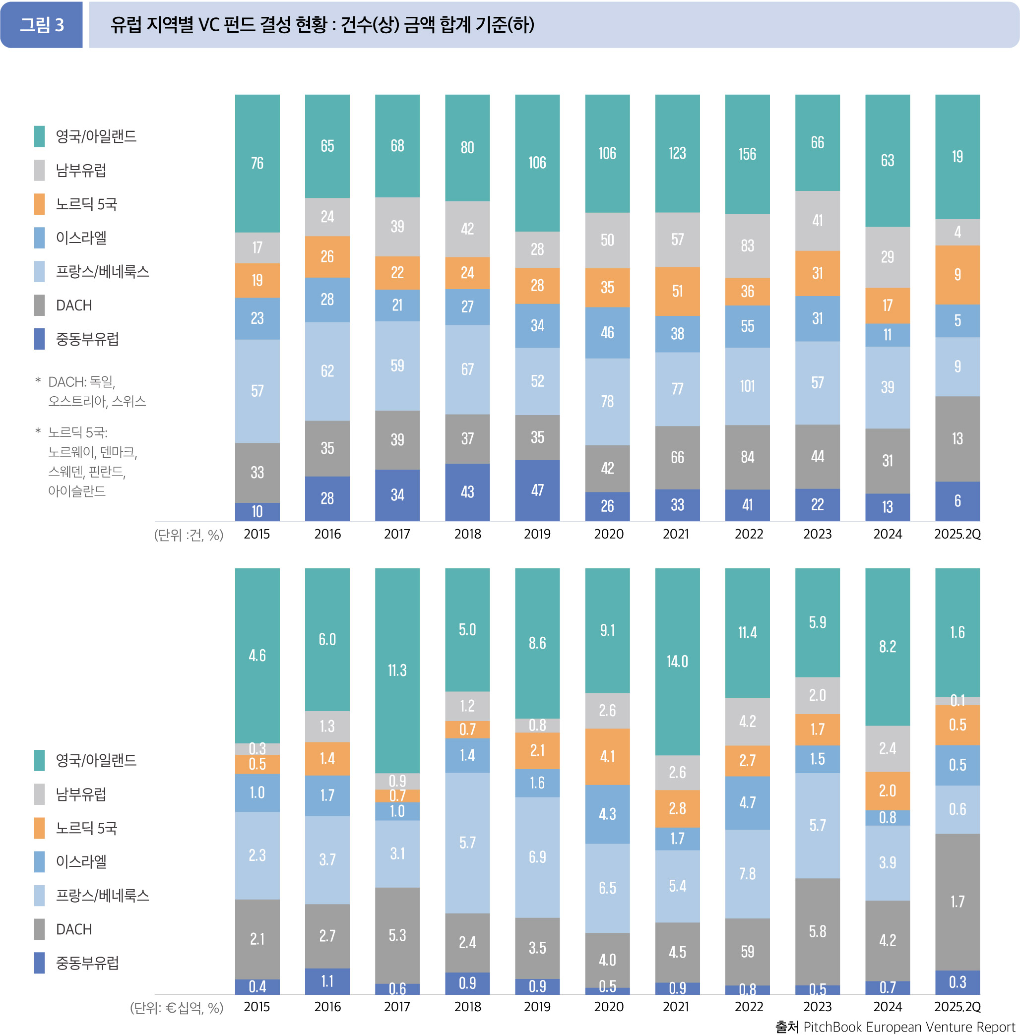 지역별 펀드 결성 현황은 금액 기준으로 볼 때 DACH 16.9억 유로, 영국/아일랜드가 15.6억 유로로 두 지역이 유럽 전체 펀드 결성 규모(52.2억 유로)의 약 62.1%를 차지했다. 두 지역의 결성 건수는 32건으로 총 결성 건수의 49.2%의 점유율을 보인다.