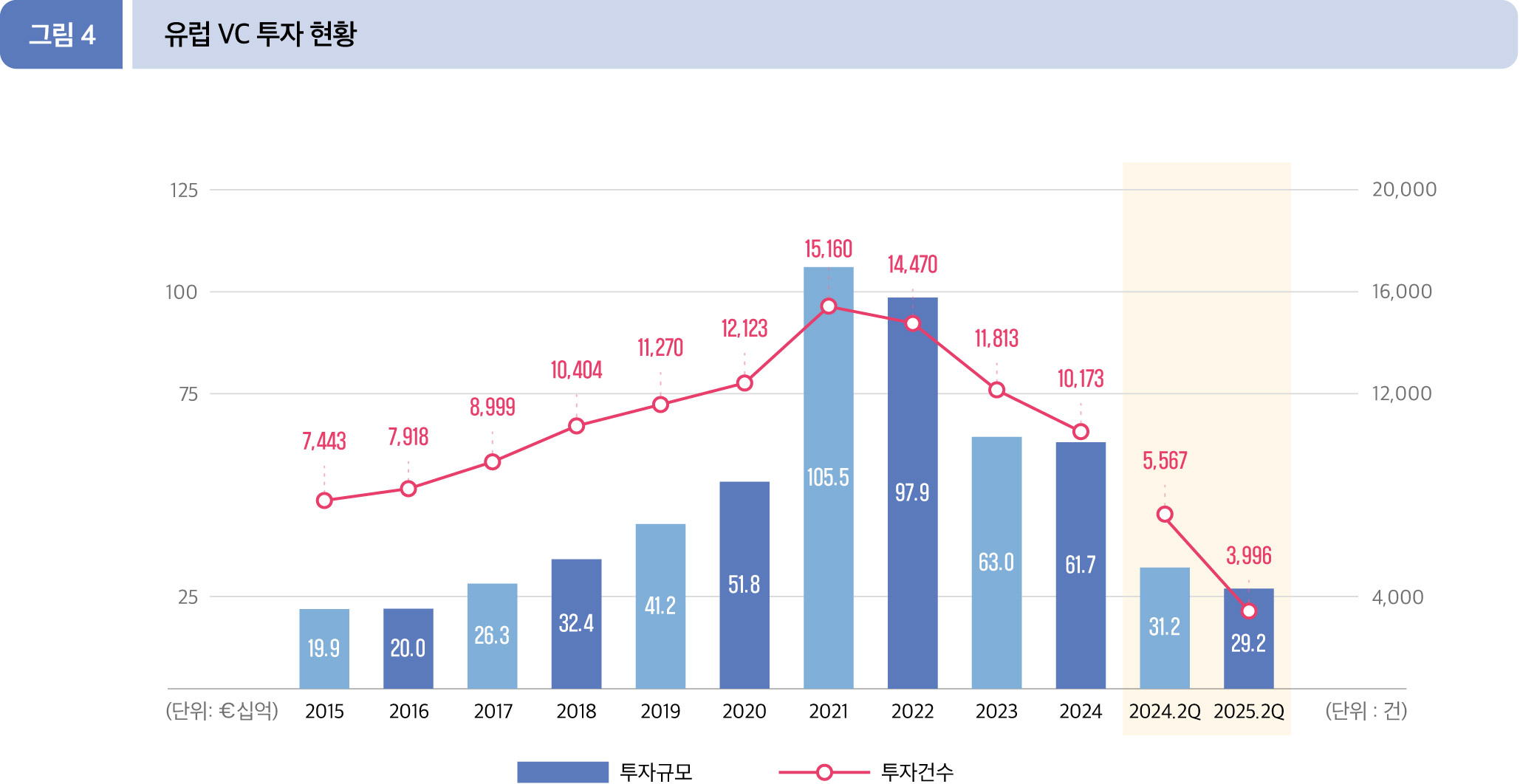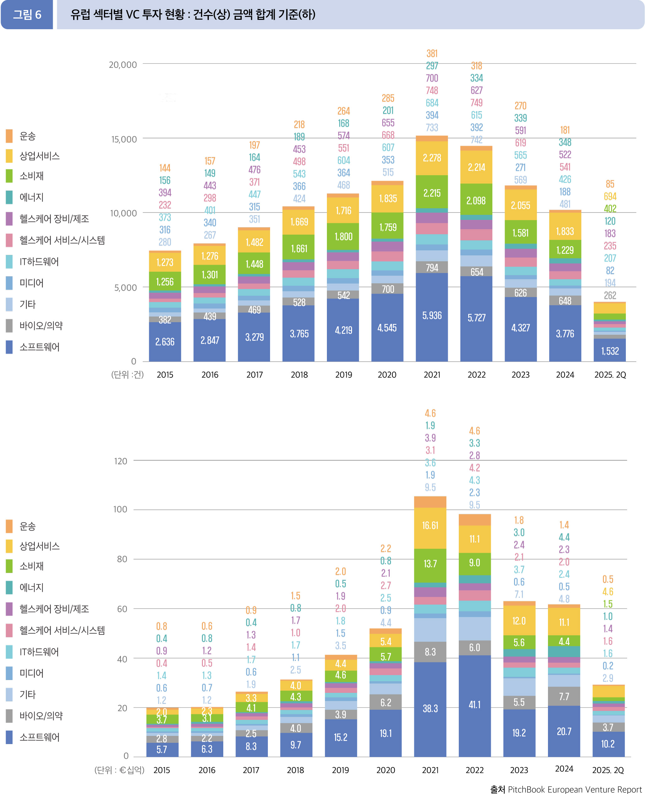 2025년 2분기 누적(1월~6월) 동안 유럽에서는 총 292.3억 유로(3,996건)의 투자가 이루어졌다. 전년 동기(311.6억 유로, 5,567 건) 대비 투자 규모는 6.2%, 투자 건수는 28.2% 감소한 수치이다.