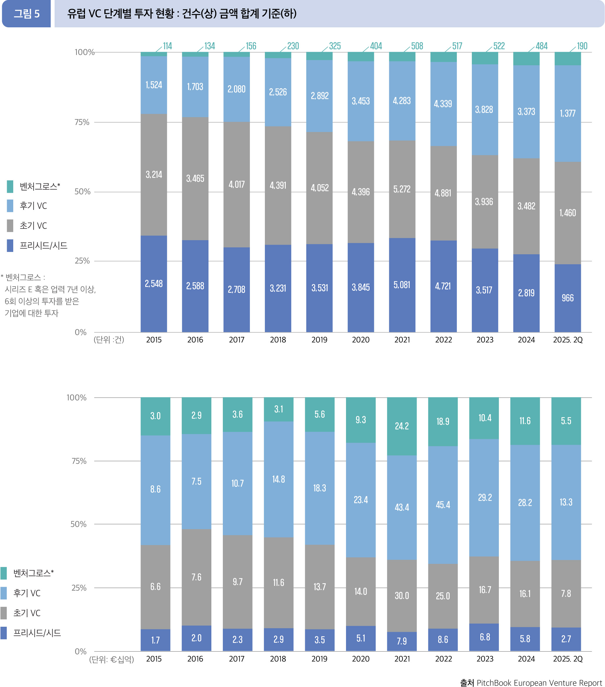 2025년 2분기 누적(1월~6월) 유럽 VC 투자에서 후기 VC 단계의 투자 금액은 총 133.5억 유로로, 전체 VC 투자 금액 292.3억 유로 중 45.7%를 차지했다.