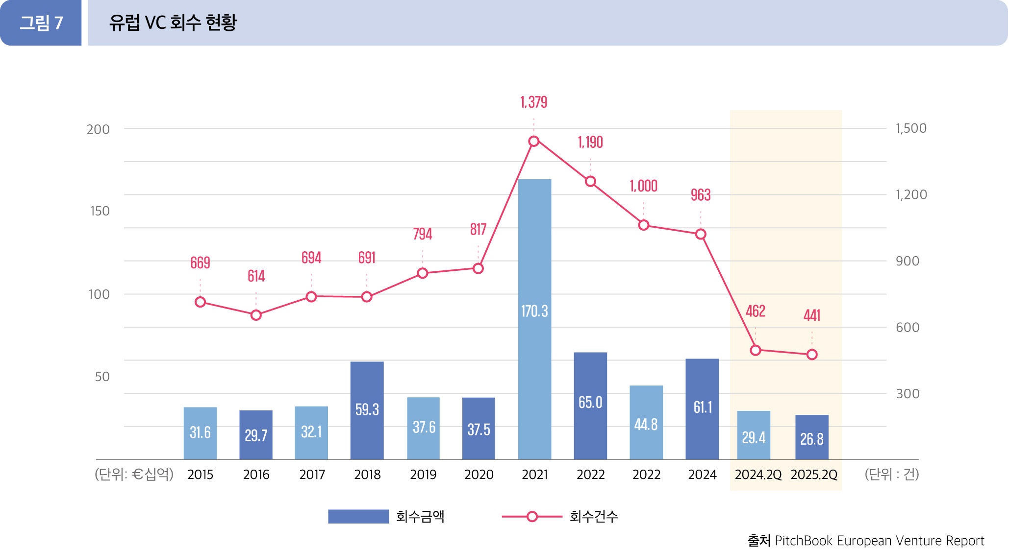 2025년 2분기 누적(1월~6월) 동안 유럽 VC 시장에서는 총 268.0억 유로(441건)가 회수되었는다, 전년 동기인 2024년 2분기 (293.8억 유로, 462건)와 비교할 때, 회수 금액은 8.8%, 회수 건수는 4.6% 감소한 수치이다.