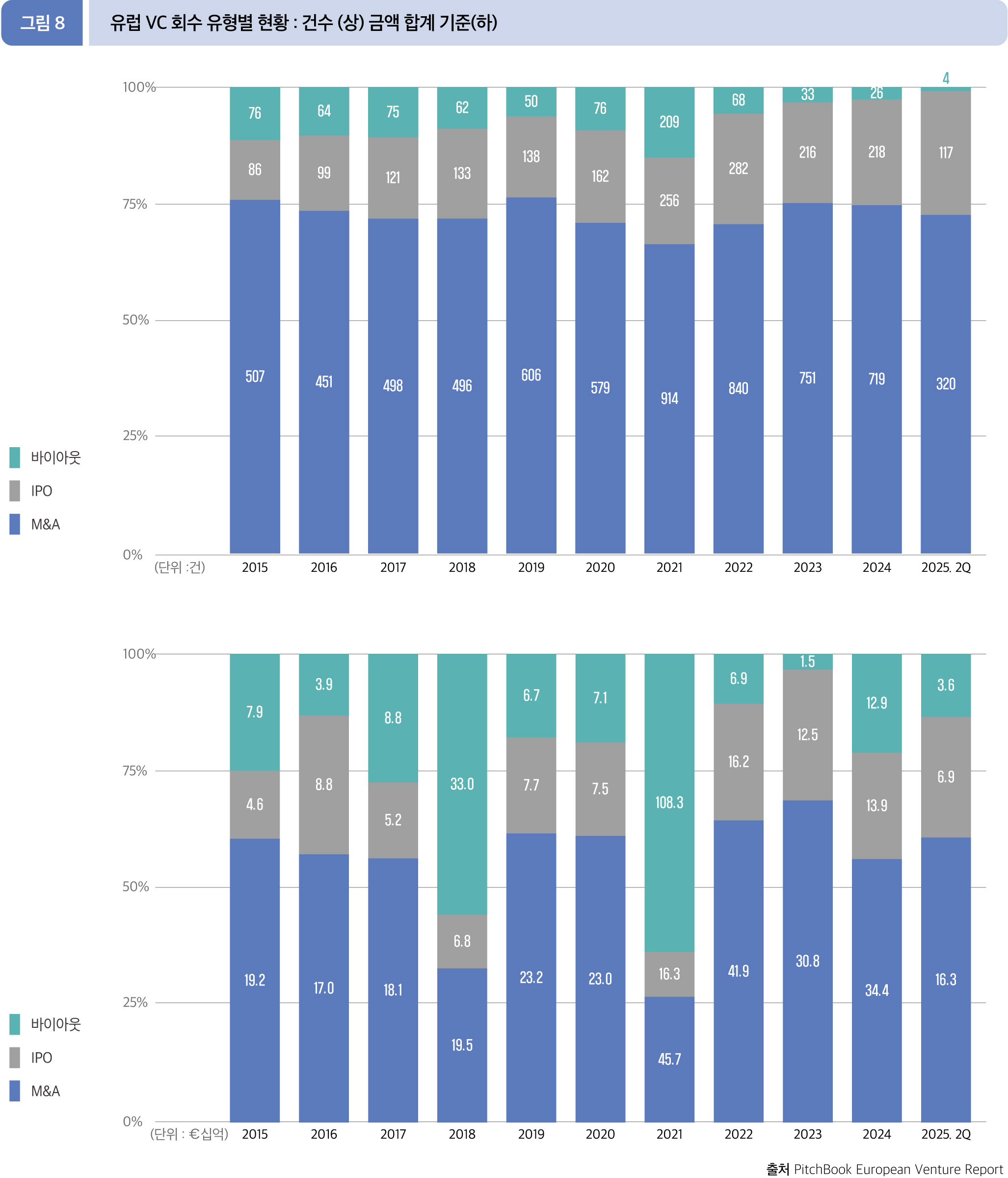 2025년 2분기 누적(1월~6월) 유럽 VC 시장에서 M&A는 총 162.6억 유로의 회수가 이루어지며, 전체 금액 중 60.7%의 비중을 차지했다. 건수도 총 320건으로 72.6%의 비중을 보였다.